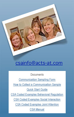 CSA is an assessment tool designed for infants, toddlers, and children with multiple physical, sensory, speech, and cognitive/linguistic challenges. CSA is an objective measure for sampling and analyzing communication behavior (means and functions) in natural interactions.